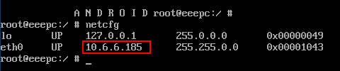 First, you need to know the IP of your Android x86 VM. To do this, hit ALT-F1 in the VM and use the ‘netcfg’ command to know the IP address given to your eth0 device: