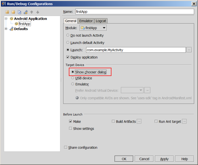 Now go back to Intellij, display your run configuration and make sure that the “show chooser dialog” option is selected: