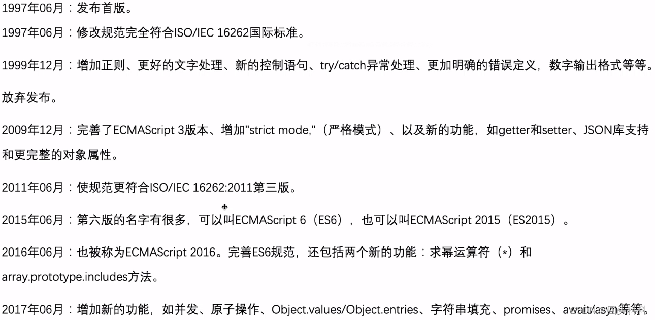 ECMA,希望这门语言能够成为国际标准。次年,ECMA发布262号标准文件(ECMA-262)的第一版,规定了浏览器脚本语言的标准,并将这种语言称为ECMAScript,这个版本就是1.0版。