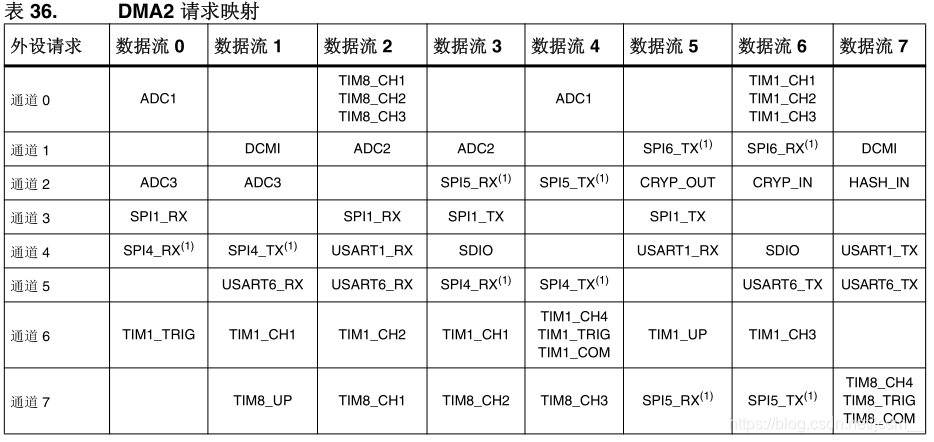 - DMA1 控制器 AHB 外设端口与 DMA2 控制器的情况不同,不连接到总线矩阵,因此,仅 DMA2 数据流能够执行存储器到