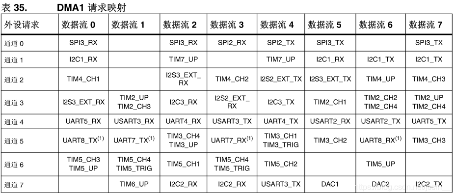 - 5 个中断事件标志:DMA 半传输、DMA 传输完成、DMA 传输错误、DMA FIFO 错误、直接模式错误