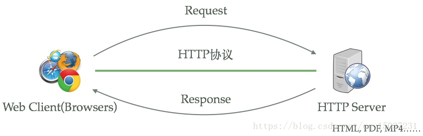 HTTP服务器本质上也是一种应用程序——它通常运行在服务器之上,绑定服务器的IP地址并监听某一个tcp端口来接收并处理HTTP请求,这样客户端(一般来说是IE, Firefox,Chrome这样的浏览器)就能够通过HTTP协议来获取服务器上的网页(HTML格式)、文档(PDF格式)、音频(MP4格式)、视频(MOV格式)等等资源。下图描述的就是这一过程: