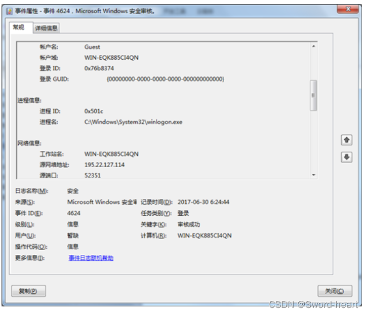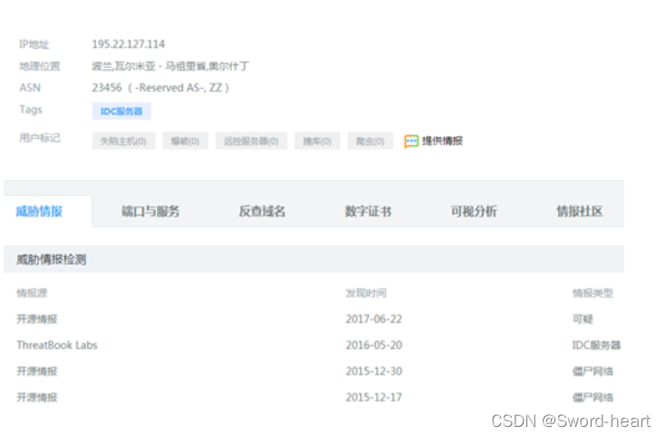根据文件被加密的时间,排查文件被加密的时间前后的安全日志,看是否有异常ip地址远程登录了服务器,如果发现公网ip登录服务器(如下图某次应急事件中我们发现195.22.127.114这个ip远程登录了服务器)对于公网ip,可以结合威胁情报去确认该ip是否为异常ip(通过微步在线查询ip地址195.22.127.114,发现该ip地址来自波兰,瓦尔米亚-马祖里省,奥尔什丁,该地址被微步识别为僵尸网络,很明显这个地址不会是管理员用来登录服务器的ip地址),截图取证。