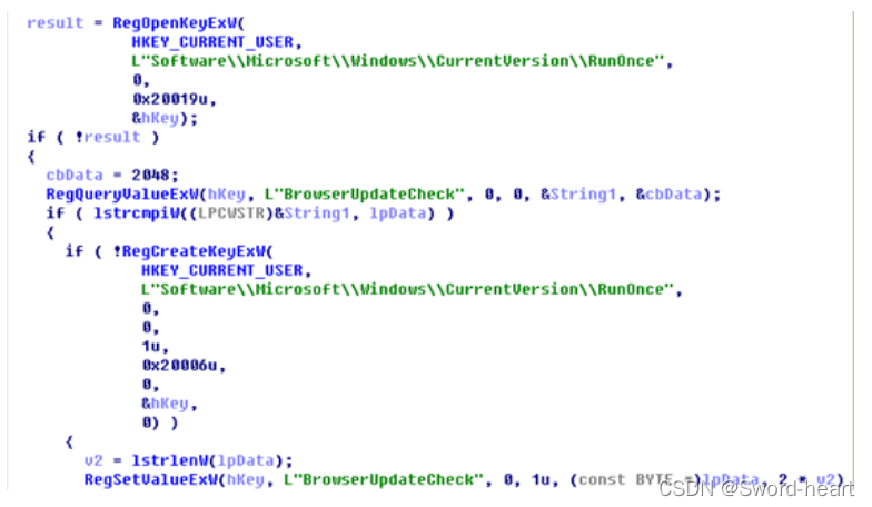 复制自身到%LOCALAPPDATA%或%APPDATA%目录之后,进行持久化操作,设置自启动项,注册表项为HKEY_CURRENT_USER//Software//Microsoft//Windows//CurrentVersion//RunOnce//BrowserUpdateCheck实现开机自启动,反汇编代码如图所示: