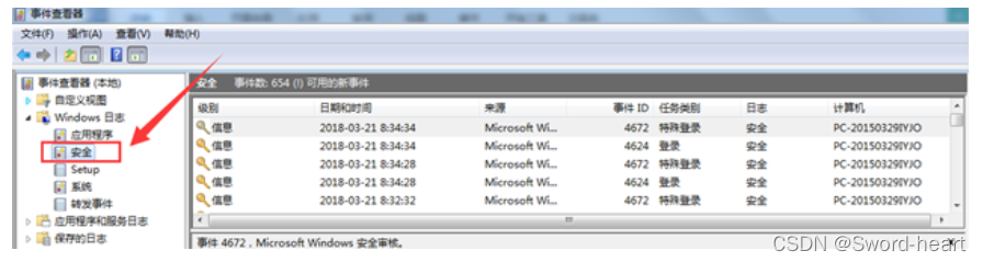 (9)Win+R运行eventvwr,打开时事件查看器,打开安全日志(windows安全日志分析可参考附录4.3)。