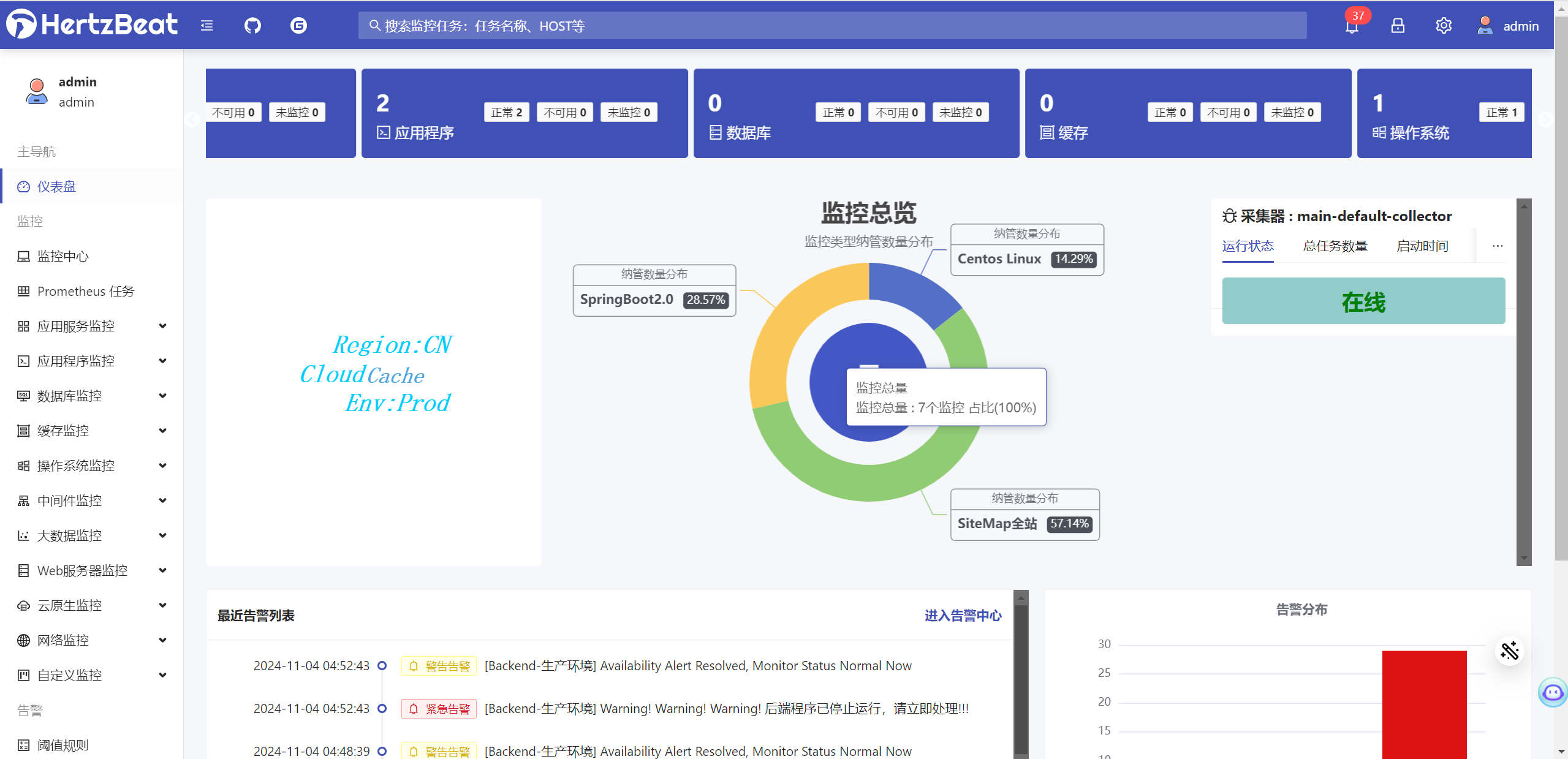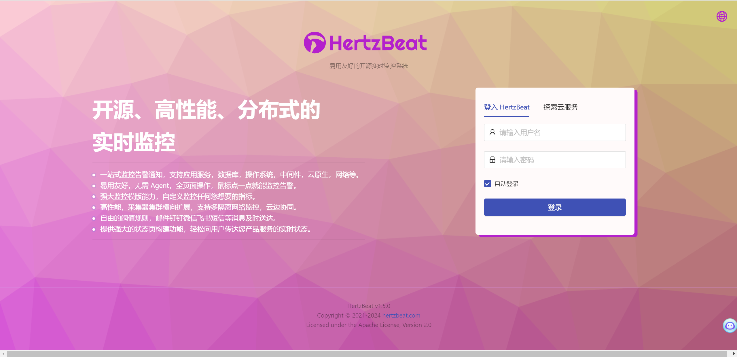 HertzBeat(赫兹跳动) 是一个开源实时监控系统,无需Agent,性能集群,兼容Prometheus,自定义监控和状态页构建能力。HertzBeat 的强大自定义,多类型支持,高性能,易扩展,希望能帮助用户快速构建自有监控系统。HertzBeat(赫兹跳动) 开源实时监控系统存在默认口令。