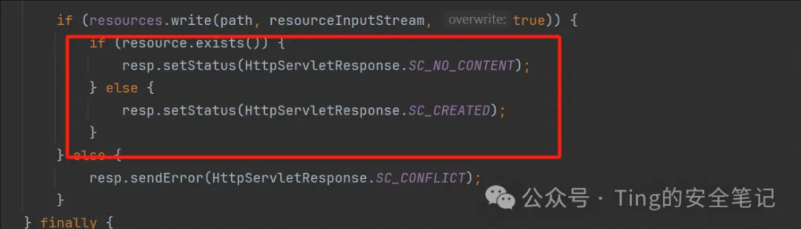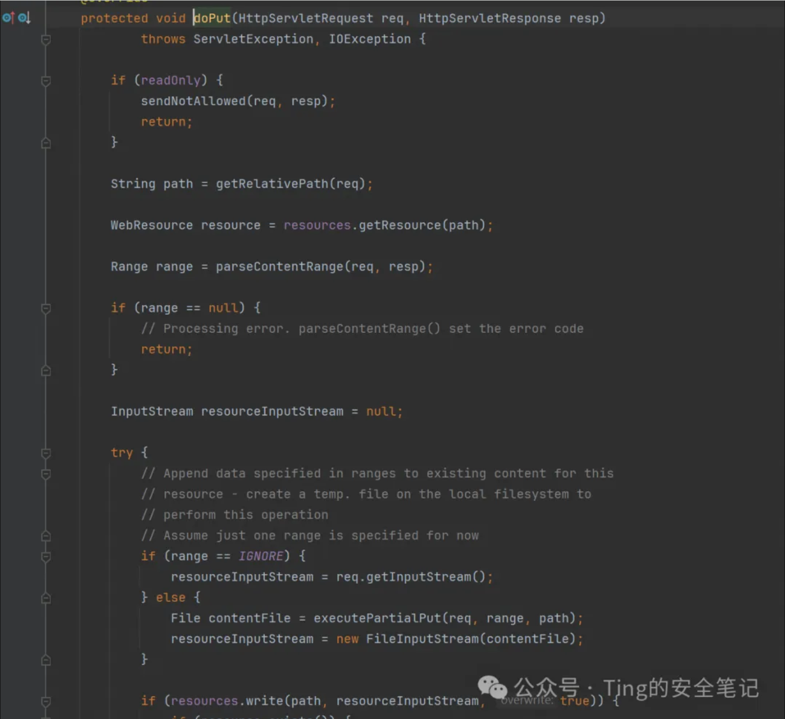 当请求的后缀为jsp或jspx的时候交由JSP servlet进行处理请求,此外交给default servlet进行处理请求。而我们查看CVE-2017-12615的payload可知,它对文件后缀采取了一些绕过,例如PUT一个1.jsp/、1.jsp空格、1.jsp%00从而绕过JSP servlet的限制,让default servlet来处理请求。当default servlet处理PUT请求时如下图