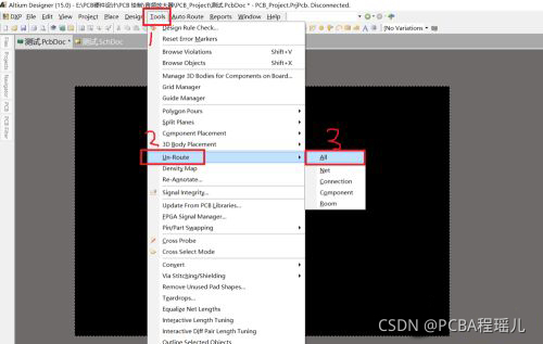 这是自动布线出来的结果,我们要的是自动布局,不要布线。所以在点击【Tool】->【Un-Route】->【All】。然后就出现了如图所示的没有布线的布局。