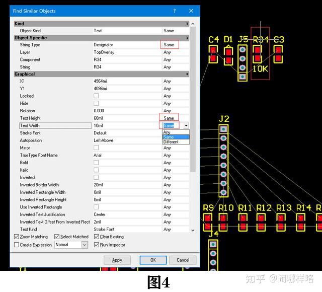 如图三中R34这个编号看起来是不是有点大,要怎么修改它的大小呢?你可以依次按快捷键“E”“N”,想修改哪一个就选择哪一个,选中后在弹出的窗口中,如图四所示,把其中三个红框选中的地方都改为Same,先点击“Apply”再点击“OK”。