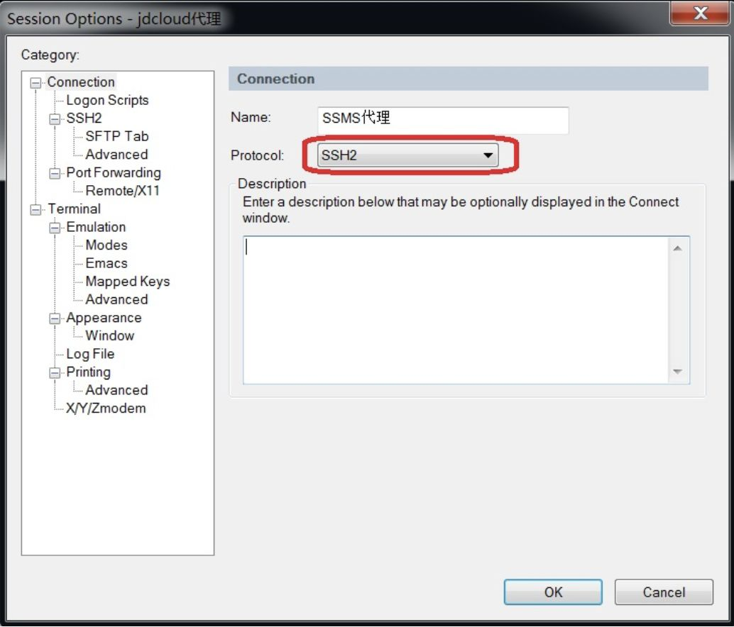 步骤3:在SecureCRT中连接协议选择“SSH2”,并配置公网云主机的IP;
