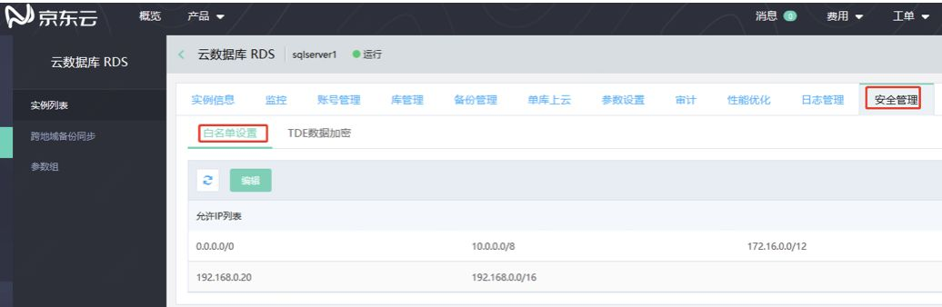 步骤1:京东云数据库RDS->实例列表->《实例名称》->安全管理->白名单设置->编辑->添加访问端IP;