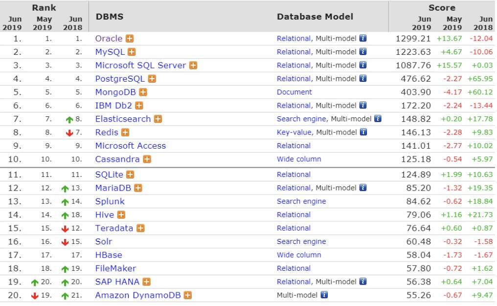 DB-Engines 数据库流行度排行榜6月更新已发布,总体排名和上个月相比基本一致,其中排名前三的Oracle、MySQL 和 Microsoft SQL Server也是分数增加最多的三个数据库,增加的分数分别为13.67、4.67和15.57,三者的总分也均已超过一千。