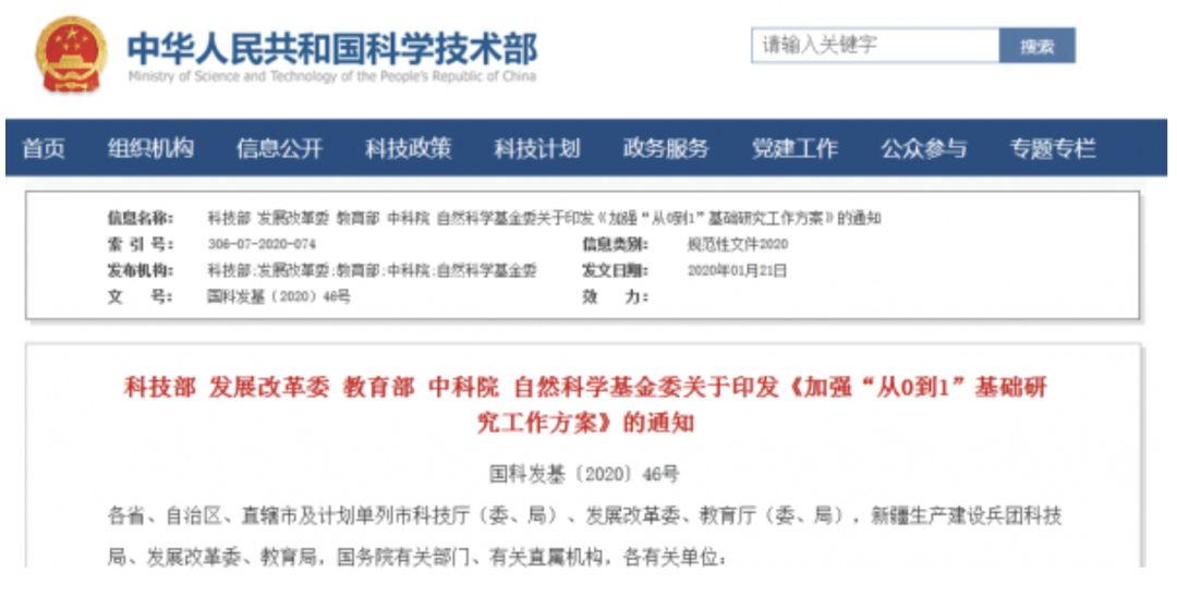科技部、发展改革委、教育部、中科院、自然科学基金委发布《加强“从0到1”基础研究工作方案》。各省、自治区、直辖市及计划单列市科技厅(委、局)、发展改革委、教育厅(委、局),新疆生产建设兵团科技局、发展改革委、教育局,国务院有关部门、有关直属机构,各有关单位: