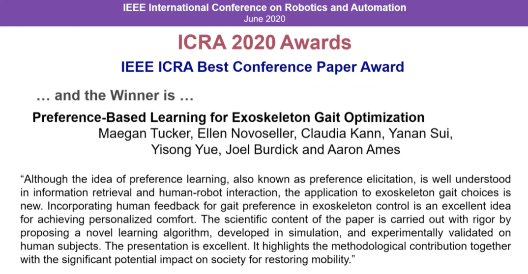 上周末,机器人领域顶级会议 ICRA 2020 放出了所有奖项的结果,来自加州理工和清华大学的 Maegan Tucker 等人的工作获得了本届大会最佳论文奖。本论文还同时获得最佳人机交互论文奖(Best Paper Award on Human-Robot Interaction)。
