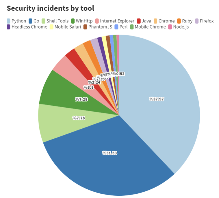按工具来分类,Python 依旧是大多数黑客的首选武器,紧接着是使用量增长迅速的 Go 语言;再其次是 WinHttp 库,该库主要由 Windows 上运行的 .net 和 CPP 使用;Shell 工具(如 cURL、wget 等)也榜上有名。浏览器也是常用的攻击工具。数据显示, Python 是 RCE/RFI、文件上传和数据泄漏中占比最大的工具,而 Go 在常规自动攻击中更强大。