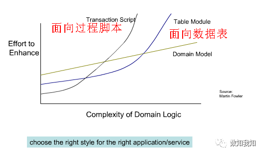 以下图片来自软件开发教父:Martin Fowler。诚然,为应付越来越复杂的业务逻辑,以自顶向下设计的领域聚合模型替代数据表模型,才能真正实现以业务实体为核心的灵活拓展: