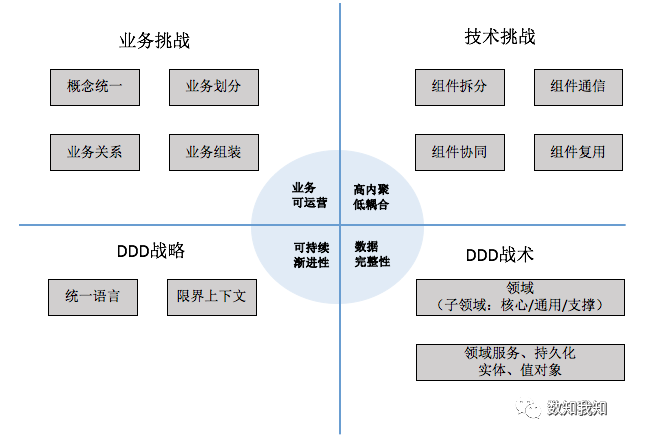 上图中间圆弧描述的是我们在对组件拆分时参考的原则(业务可独立运营、高内聚低耦合、数据完整性、渐进性),以此为基础,在应对业务和技术视角上的挑战时,我们采取的相关 DDD 战略和战术。