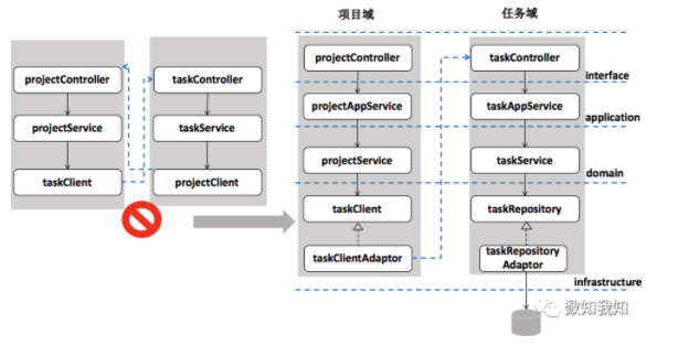于是,我们在落地的时候,淘汰了下图左侧的实现方式——合作关系(项目和任务网状式相互调用,我中有你,你中有我),而是在下游项目领域加了一层适配层,来隔离业务的变化对上游的影响。同时,也确保任务这层逻辑干净、清晰,以供更多其他组件复用。