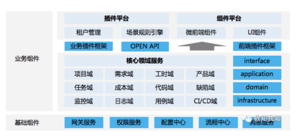 最终,我们形成了一个组件化方案:根据划分出来的领域,将系统拆分成业务组件(核心子领域)和基础组件(通用和支撑子领域),各组件前后端分离。即会有以下前端应用:需求管理、项目管理、缺陷管理、用例管理等;后端应用相应提供不同的领域服务,领域服务采用分层架构(interface, application, domain, infrastructure)。权限管理、网关服务、消息服务等基础组件下沉,实现最大化组件复用。