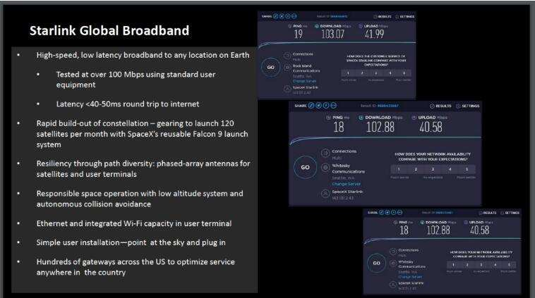 在最近提交给美国联邦通信委员会(FCC)的一份演示文稿中,美国太空探索技术公司 SpaceX 披露了其星链互联网的两项重要测试结果。演示文稿显示,SpaceX 使用美国互联网流量监测机构 Ookla 的 Speedtest.net 服务进行了两项基准测试,星链互联网的下载速率为 102 至 103Mbps,上传速率为 40 至 42Mbps,延迟为 18 至 19 毫秒。这意味着,该网络可以支持多个用户同时玩多人视频游戏和观看超高清视频,且已实现 20 毫秒以下的延迟,与地面宽带大致相当。