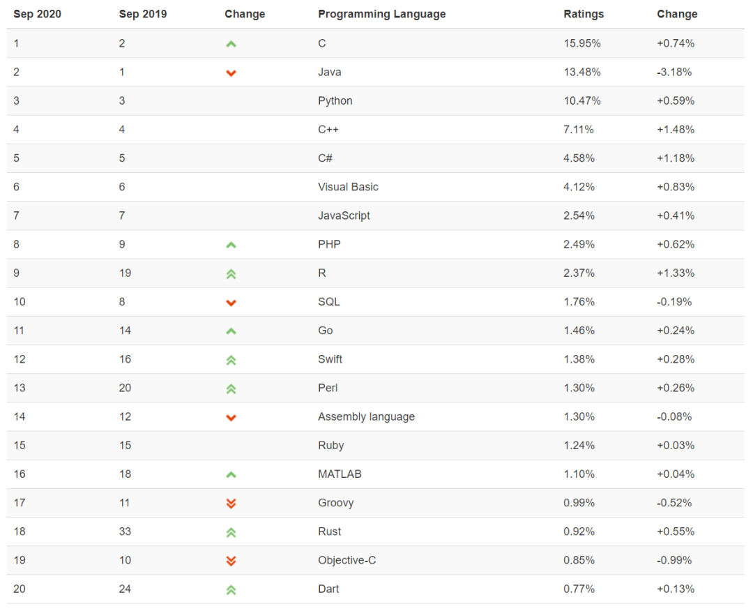 2003 年是 C++ 的巅峰时期,当年 8 月,它的 TIOBE 排名峰值为 17.53%,接近第二名,并拿下了当年的年度编程语言奖。但 2005 年之后,C++ 的榜单排名再也没有超过 10%,甚至在 2017 年达到历史最低值 4.55%。但是,与去年相比,C++ 现在是榜单中增长最快(+1.48%)的语言。TIOBE CEO Paul Jansen 认为,新的 C++ 20 标准带来了极大的正面影响。C++ 的积极趋势赶超了其他语言,例如 R(+1.33%)和 C#(+1.18%),以及与去年相比损失了 3.18% 排名率的 Java。