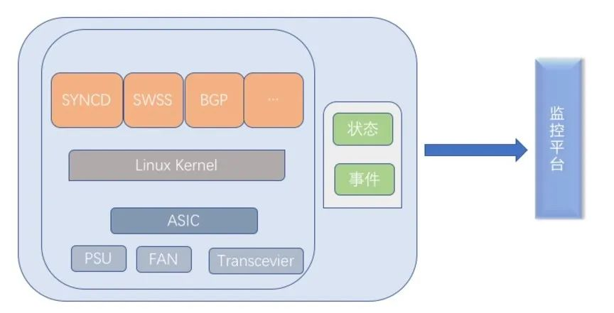 JDNOS系统架构是基于database的,监控平台可以通过telemetry订阅监控database中的任何数据,因此可以自定义更多的监控内容,包括光模块各属性(收发光功率,温度,电压等),BGP邻居状态,交换机buffer的状态(使用率,阈值)等等,监控平台可以实时得获取到网络设备的状态。
