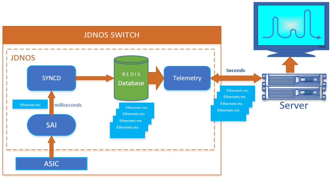 流量统计是网络监控很重要的一项监控内容,传统的流量监控是粗粒度的,基于分级的监控,对于瞬间突发性的流量可能无法感知。尤其是对于京东商城每年618或者双11的大促活动,这种粗粒度的统计,监控平台无法监控到某一时间点的瞬时流量波动。JDNOS开发了基于毫秒级的流量监控,在监控数据的颗粒度上,从分钟级提升到秒级甚至到毫秒级,可以看到任何一秒的流量数据,使监控进入了毫秒级时代。 JDNOS以毫秒级的粒度获取ASIC的端口流量统计,并存入database中。为了减小网络负载,减轻监控平台压力,使用Telemetry的方式以秒级的频率向监控平台推送统计数据。这样监控平台可以得到基于毫秒级粒度的流量波动图。