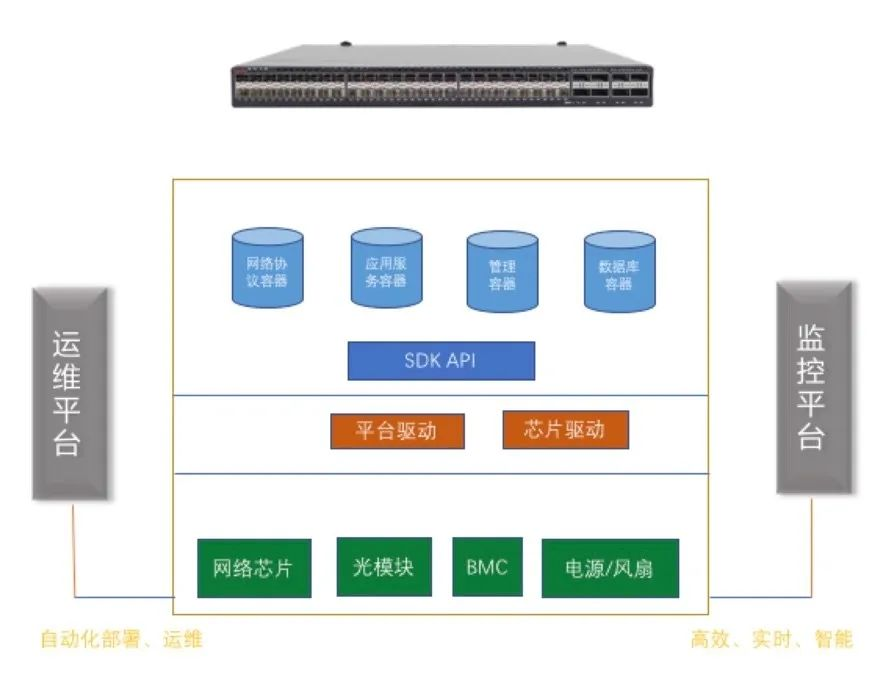 数据中心网络管理周期从网络建设开始,到设备交付,部署,变更,一直到下线。为了能够提高全周期效率,提供高可靠管理服务,京东自研交换机与网络管理平台一起,实现了网络设备上电以后自动远程获取并安装版本,加载配置,系统自检,并上报平台;针对网络设备的日常变更,网络管理平台通过自研交换机提供的统一接口,自动完成网络割接;为了版本的快速迭代并实施应用,自研交换机实现了热重启功能,进程级、docker级以及整个系统级的版本升级都可以做到转发面的流量不中断。