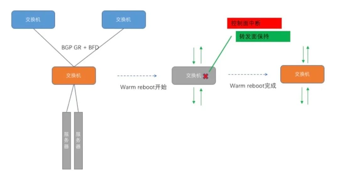 京东数据中心使用BGP路由协议,设备版本升级并warm reboot时,控制面会中断,BGP session也会down掉。但此时转发层面是工作正常的,所以对端设备不需要撤销路由,这样流量还可以经由正在重启的设备转发。所以BGP两端设备需要开启GR特性,这样即使对端设备BGP session down掉,路由也会一直保持,流量正常转发。