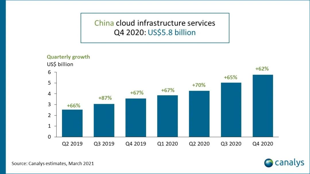 市场研究机构 Canalys 发布了《China cloud services market Q4 2020》报告指出,2020年第四季度,中国的云基础设施服务支出增长了 62%,达到 58 亿美元,创造了新纪录。高幅的增加表明了中国对云服务的需求强劲。而大流行期间的数字化转型努力,以及中国的快速经济复苏以及随后的延迟项目重启,是推动这一增长的主要因素。Canalys 研究分析师 Blake Murray 称,客户要求云服务提供商提供更先进的解决方案,以满足数据安全要求和其他特定行业的需求。随着客户对基于云的服务,特别是对人工智能和数据处理的集成度和依赖度越来越高,中国的创新步伐正在加快。这正在加速数据中心容量、连接性和数据服务的发展。
