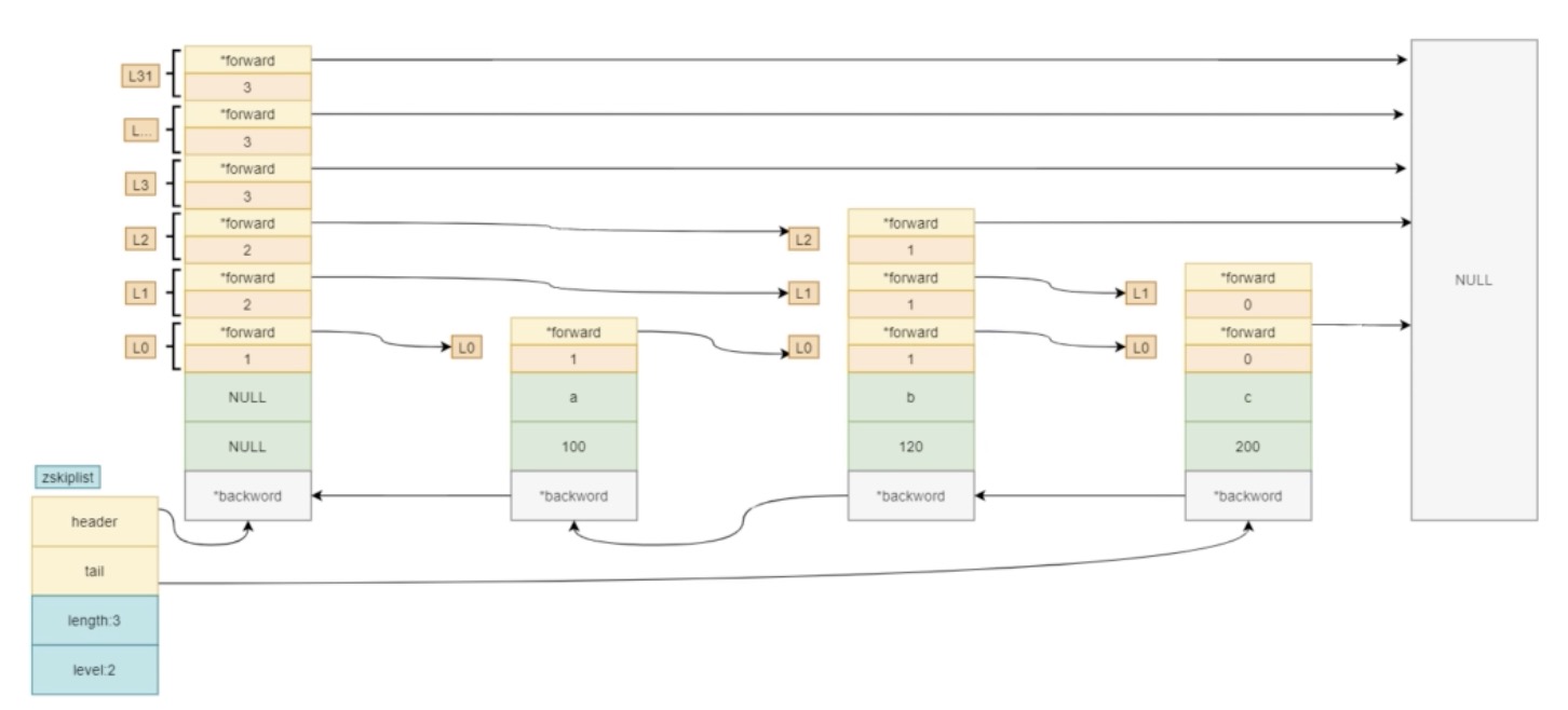 typedef struct zskiplist {// 头、尾节点;头节点不存储元素,拥有最高层高struct zskiplistNode *header, *tail;unsigned long length;// 层级,所有节点中的最高层高int level;} zskiplist;typedef struct zskiplistNode {// 元素member值sds ele;// 分值double score;// 后退指针struct zskiplistNode *backward;// 节点中用 L1、L2、L3 等字样标记节点的各个层, L1代表第一层, L2代表第二层,以此类推。struct zskiplistLevel {// 指向本层下一个节点,尾节点指向nullstruct zskiplistNode *forward;// *forward指向的节点与本节点之间的元素个数,span值越大,跳过的节点个数越多unsigned long span;} level[];} zskiplistNode;