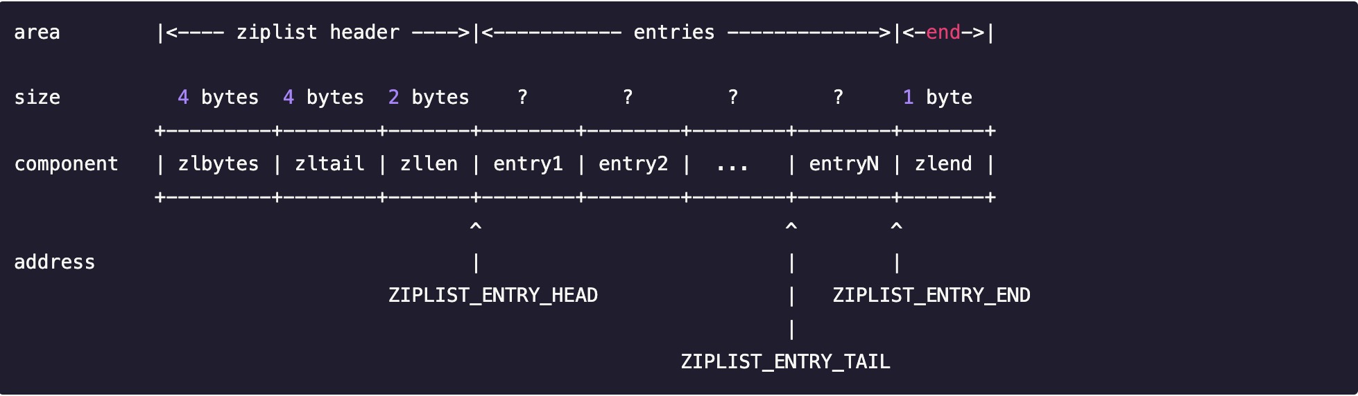 - zlbytes: 4byte 记录整个压缩列表占用的内存字节数:在对压缩列表进行内存重分配, 或者计算 zlend 的位置时使用。