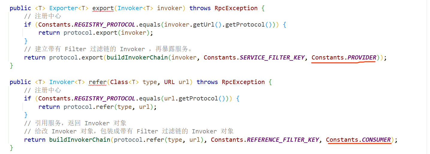 进入到核心类ProtocolFilterWrapper中,在实现类中export和refer,都采用相同的构造责任链方法buildInvokerChain,只是通过参数group进行区分