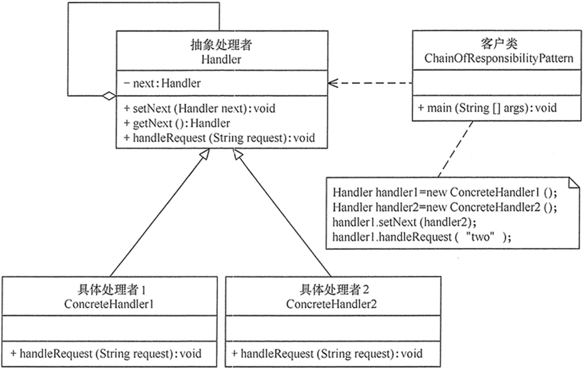 2).增强了系统的可扩展性。可以根据需要增加新的请求处理类,满足开闭原则。