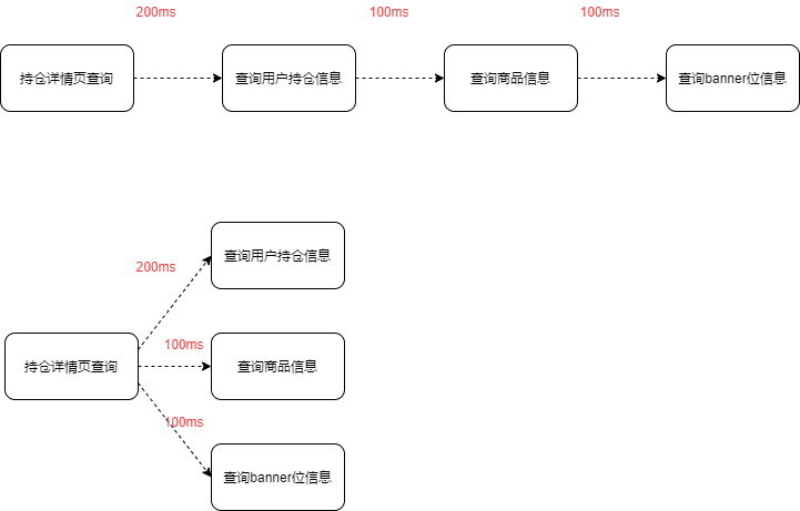 比如,理财的持仓信息展示接口,我们既需要查询用户的账户信息,也需要查询商品信息和banner位信息等等来渲染持仓页,如果是串行,基本上接口耗时就是累加的。如果是并行,接口耗时将大大降低。