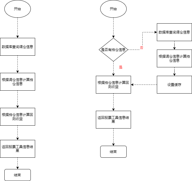 因为策略轮动的调仓信息,每周只更新一次,所以原来的调接口就去查库的逻辑并不合理,而且拿到调仓信息后,需要经过复杂计算,最终得出回测收益和跑赢沪深指数这些我们想要的结果。如果我们把查库操作和计算结果放入缓存,可以节省很多的执行时间。如图: