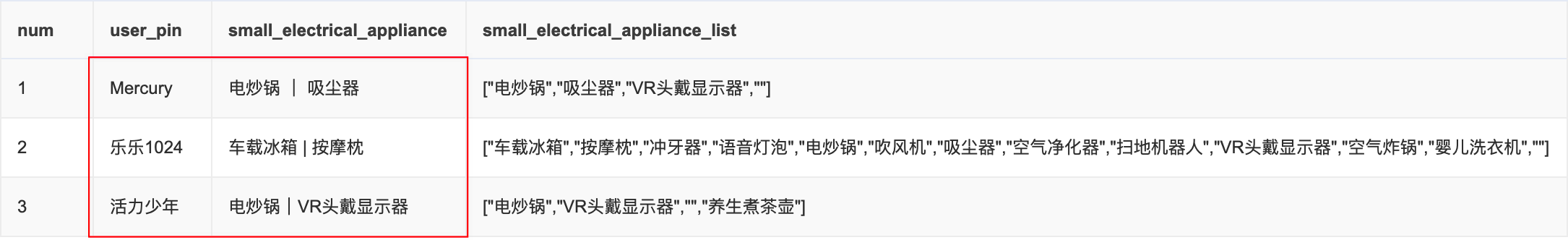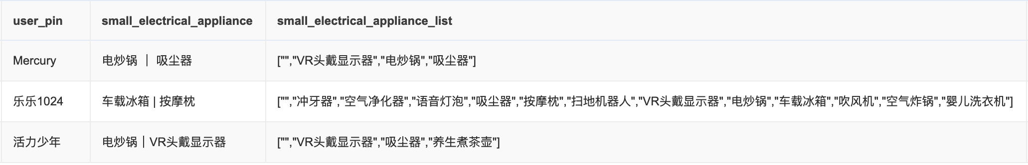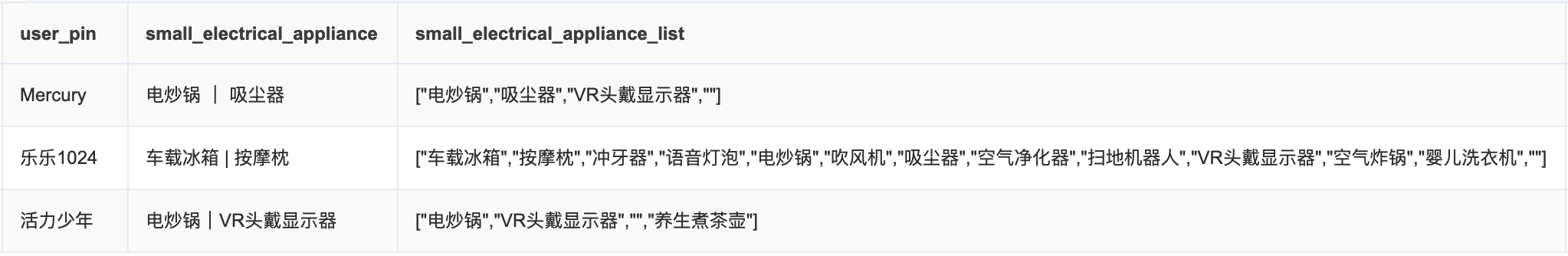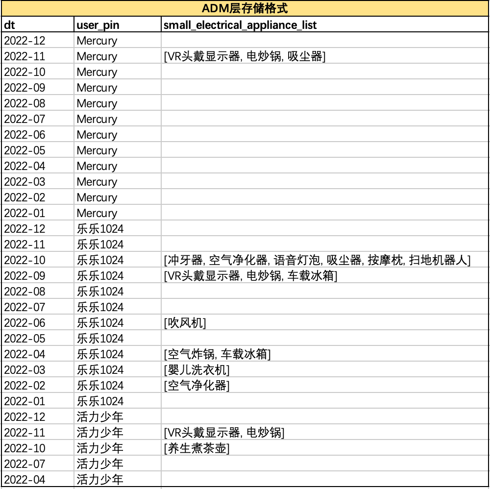 以用户’Mercury’、‘乐乐1024’、'活力少年’的购买数据为例,上游ADM层以array<string>类型存储用户每月购买的小家电相关品类,如下图所示: