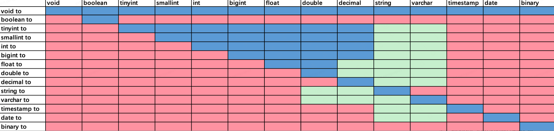 ◦ 下图为Hive和Presto的隐式转换规则,蓝色区域是Presto和Hive都支持的类型转换,绿色区域是Presto不支持但是Hive支持的类型转换,红色区域是两者都不支持的类型转换。可以看到,hive的隐式转换更为广泛,而presto尤其在字符类型的隐式转换中更为严格。