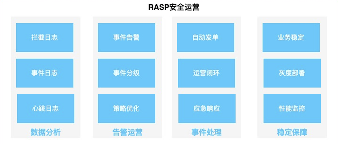 在日常京东云RASP安全运营中,如何保证业务更稳定,运营更高效,应急更及时,是我们一直思考的问题。比如要如何做到攻击告警可运营,包括拦截日志,事件日志,分级分类区别哪些需要关注,哪些必须后续处理,自动发单,漏洞修复等,做到运营闭环,事件闭环。在部署时,做到一键部署,为保证业务稳定,按半分比进行灰度部署,并且可回滚,通过配置策略告警,策略优化,监控应用各项性能指标,快速响应故障报警等。