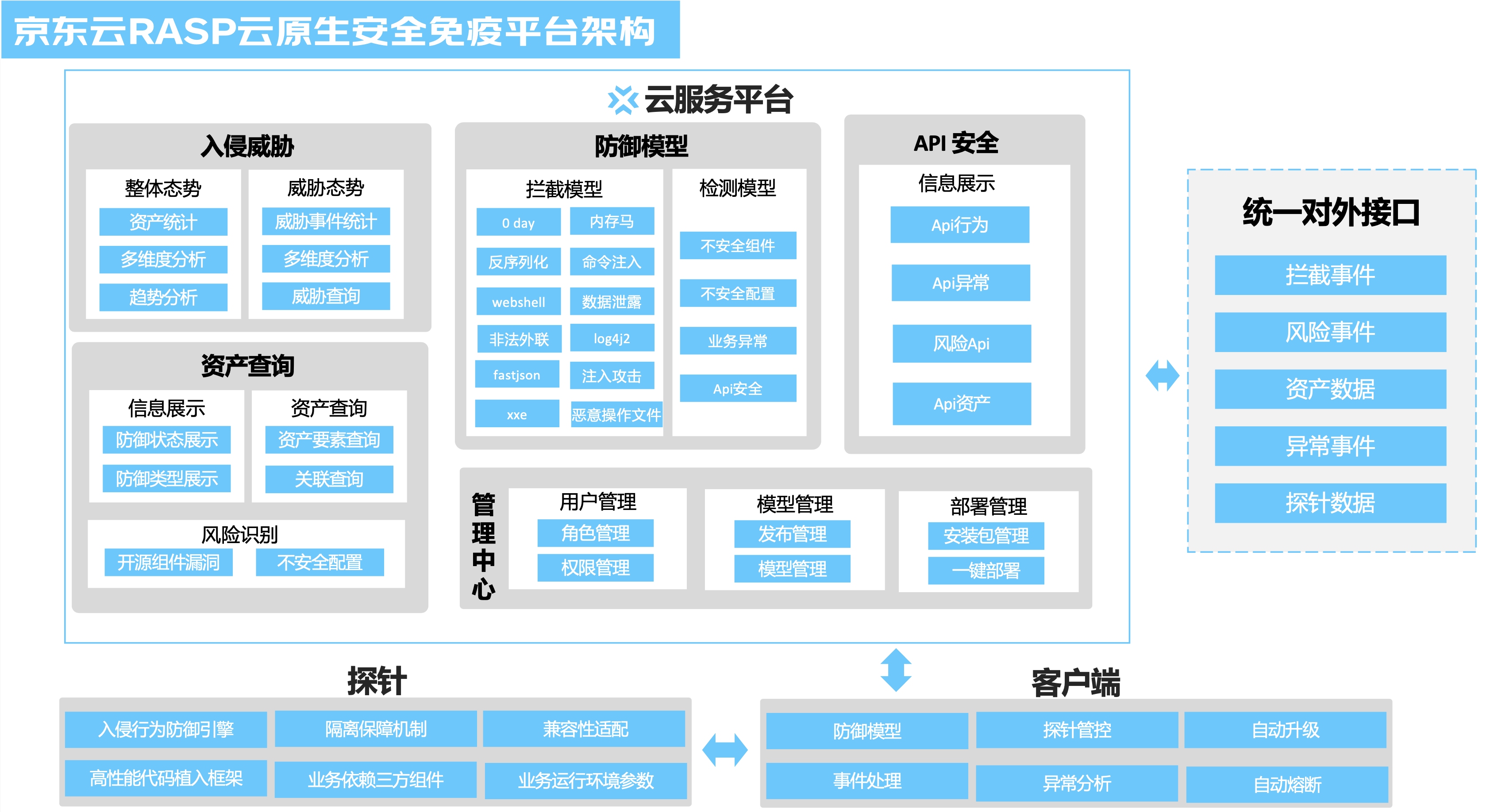京东云 RASP架构主要包括探针、客户端、云端服务三个模块。