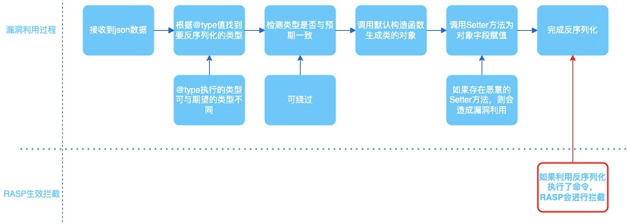 接下来,我们通过 fastjson 反序列化漏洞的攻击场景来演示 RASP应用安全的实际防护效果,fastjson 的反序列化过程主要如下: