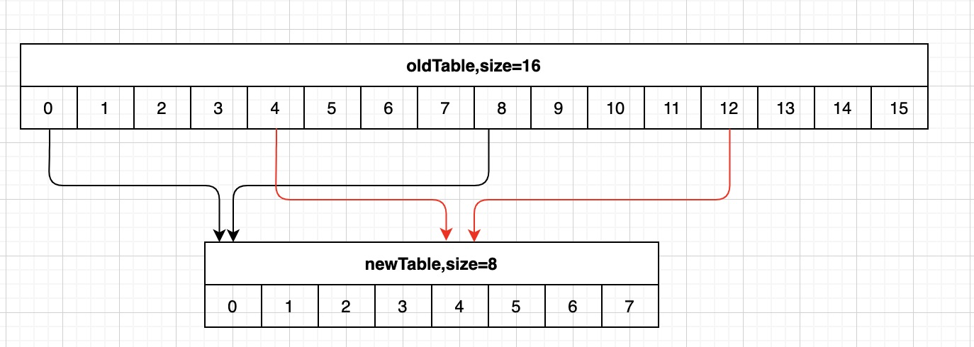 即在找目标桶时总是用当前hashtaba的sizemask(掩码)来计算,v=14即二进制000 1110,当前字典表的掩码从15变成了7即二进制0000 0111,v&m0的值为6,也就是说在新表上还要扫一遍6号桶.但是缩容后旧表6和14号桶的数据都已迁移到了新表的6号桶中,所以这时扫描的结果就出现了重复数据,重复的部分为上次未缩容前已扫描过的6号桶的数据。