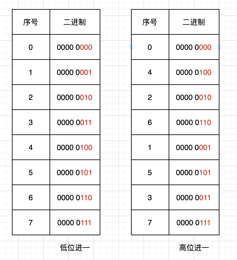 我们将Redis扫描的游标与顺序扫描的游标转换成二进制作对比: