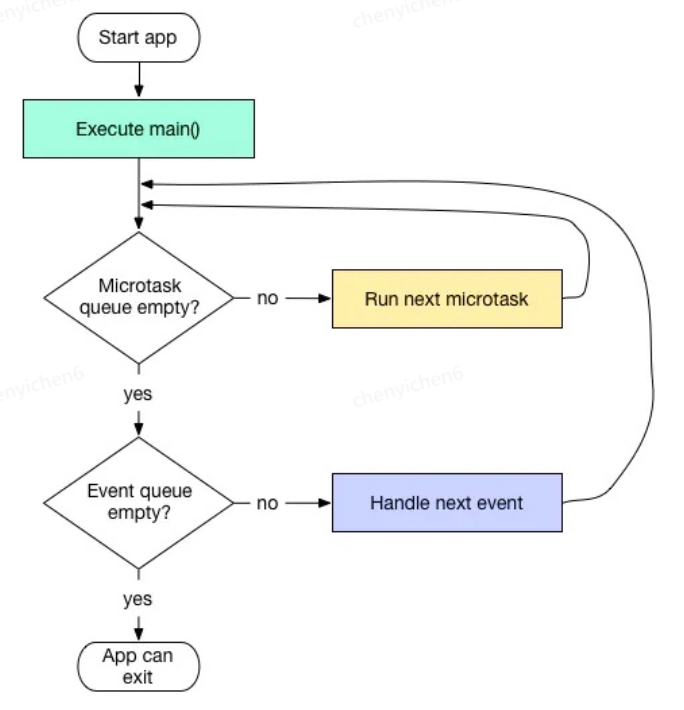 - 事件循环在 main 方法执行完毕后启动, microtask 队列中的任务会被优先处理。