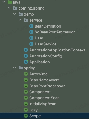 Application.java 启动类,实例化spring容器,获取userService对象,调用test方法。