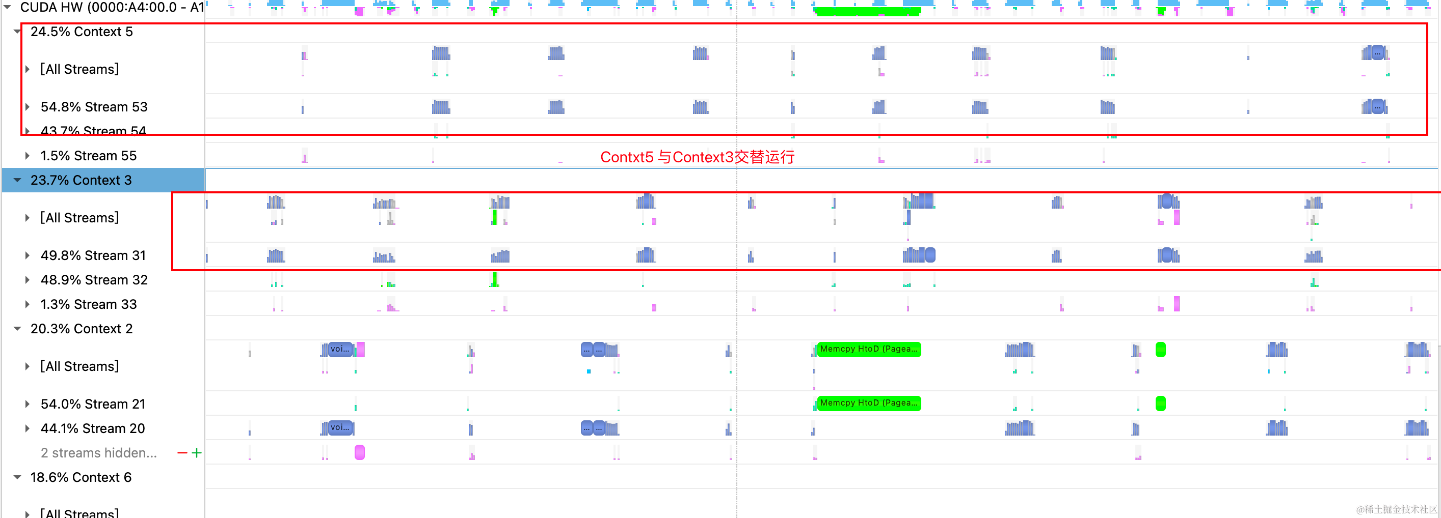多GPU通道(多CudaStream + 多CudaContext)解决了KernelLaunch调度问题,算子调度可以并行执行,减少了执行的GAP。但在GPU硬件层面,CudaContext采用分时复用原则,即此某一时刻只有一个CudaContext被调度执行,没有完全达到算子计算间的并行。