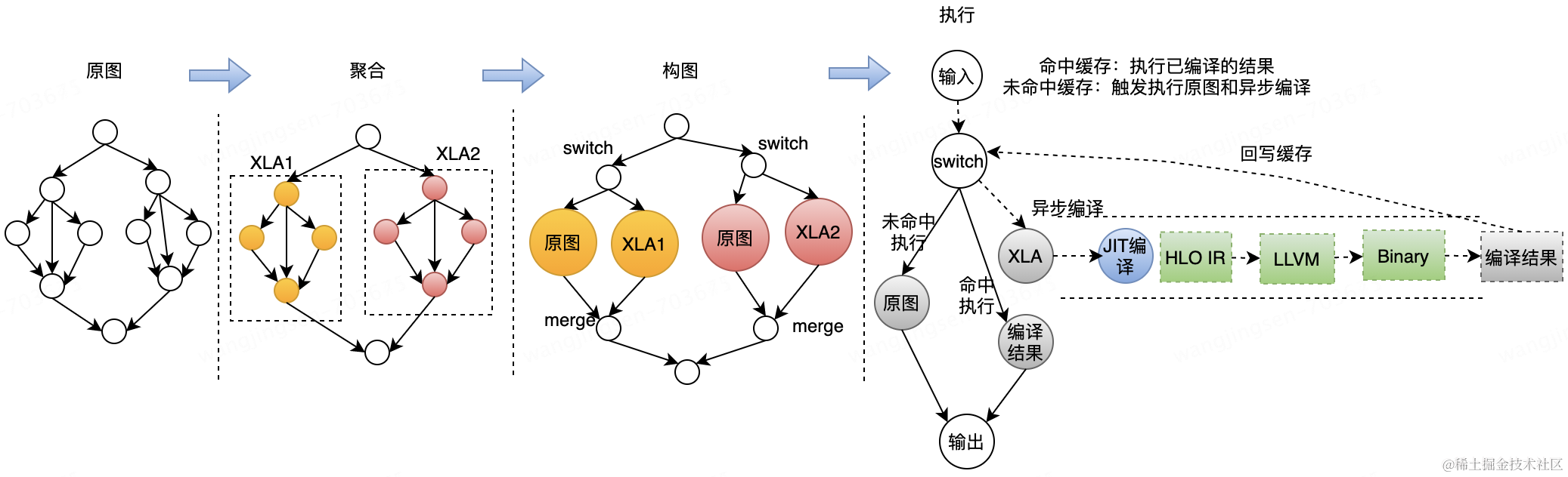 b)推理过程动态选择,命中分桶情况则选择XLA Runtime执行,未命中则选择原图执行,同时服务后台触发异步XLA编译,供下次请求使用。