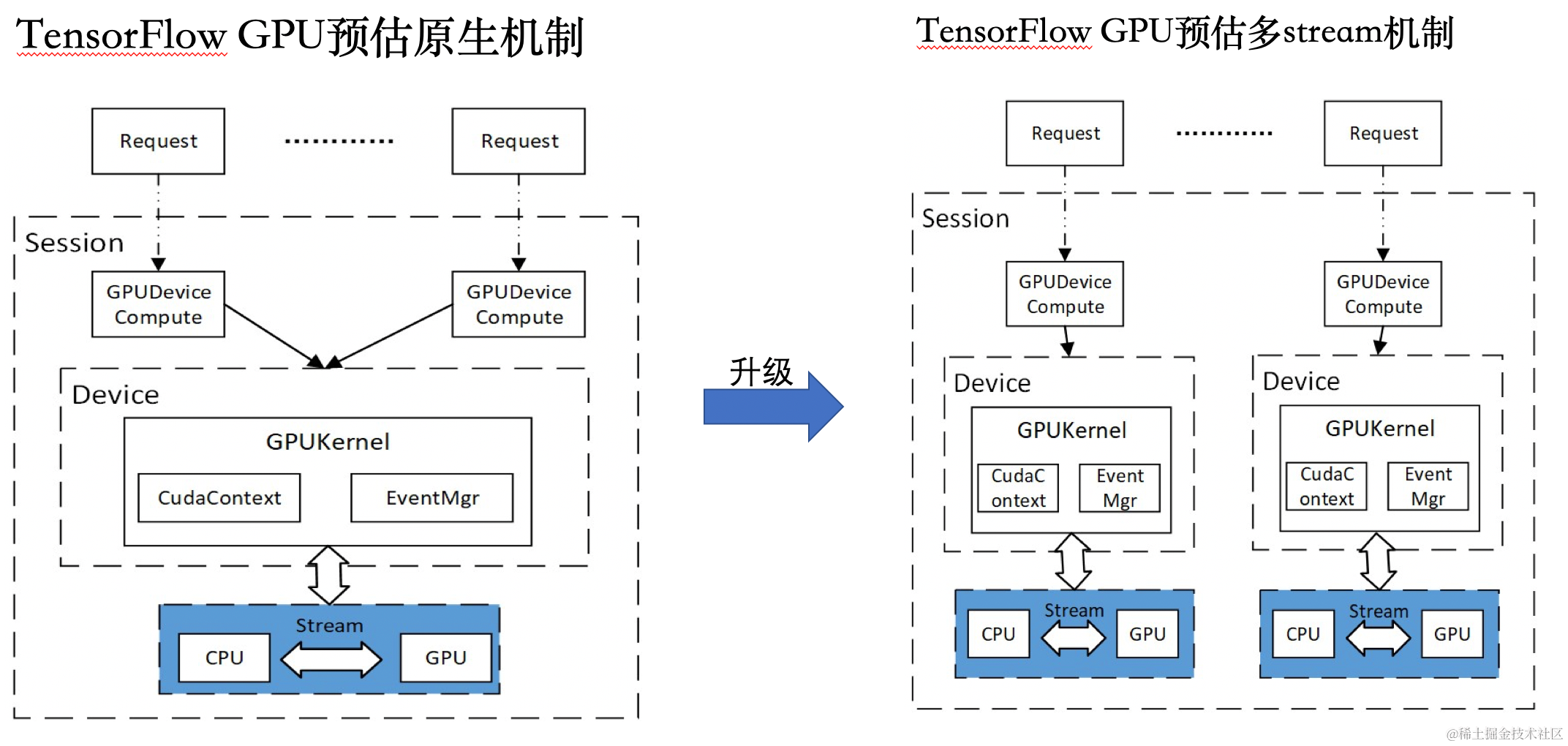 我们对Tensorflow框架中的底层GPU通道的创建和分配机制进行了深入的改造与升级,赋予了其在面对同一模型时,针对不同的在线请求,动态选择GPU通道进行运算的能力。每个GPU通道独立持有一份CUDA Stream和CUDA Context,既消除了算子并发调度导致的GPU资源争抢问题,也使得不同请求拥有独立的计算通道,提升GPU并行粒度。