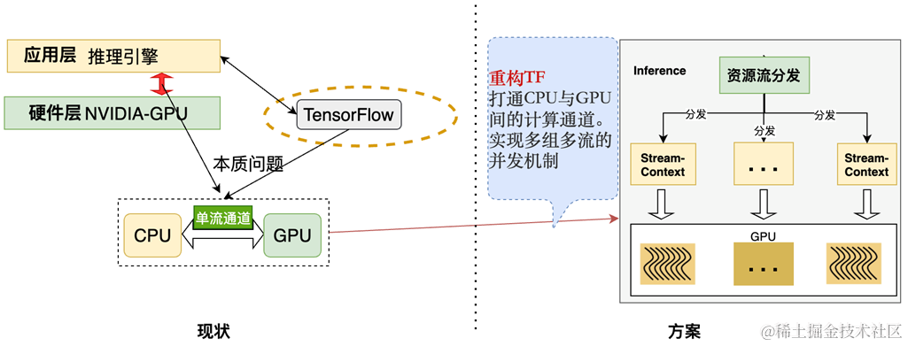 Tensorflow深度学习框架虽然提供了GPU计算能力,但其CPU到GPU的交互通道仅为单通道模式。在线并发推理的场景下,存在算子调度互斥、算子计算阻塞排队等问题。针对上述痛点我们设计了GPU多通道模式-多流计算架构,真正实现了GPU的并发计算能力。