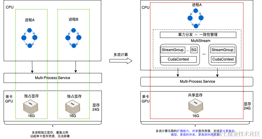 因此,我们升级了多流计算架构,将MPS与自研的多CudaStream + 多CudaContext的多流计算架构相结合,解决了显存瓶颈的问题,最终通过单进程模型部署实现真正的并行计算。